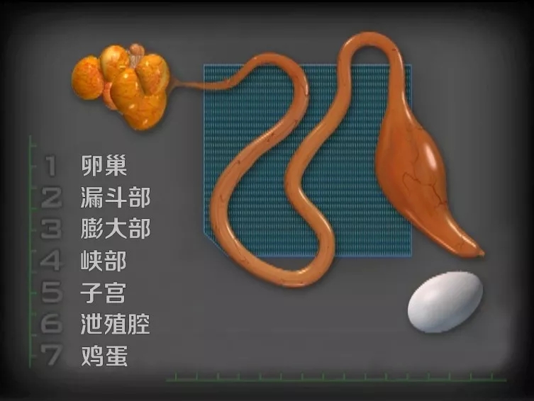 蛋雞的生殖系統(tǒng)稱為輸卵管,包括卵巢、漏斗部、膨大部、峽部、子宮、泄殖腔。大多物種的雌性動(dòng)物具有左右兩條輸卵管,但鳥類只發(fā)育了左邊那條,長(zhǎng)約2英尺(60厘米)。